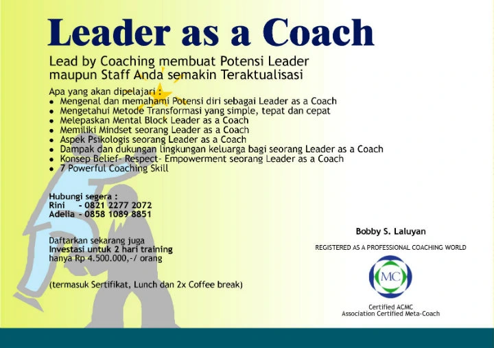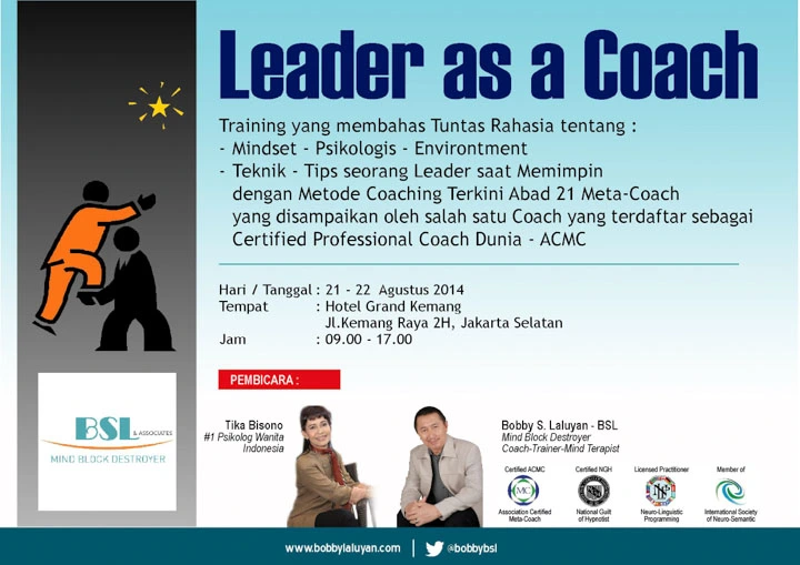 A two-day leadership training program featuring Tika Bisono and Bobby S. Laluyan, exploring mindset, psychology, mental blocks, and 21st-century Meta-Coaching methods to unlock the true potential of leaders and their teams.